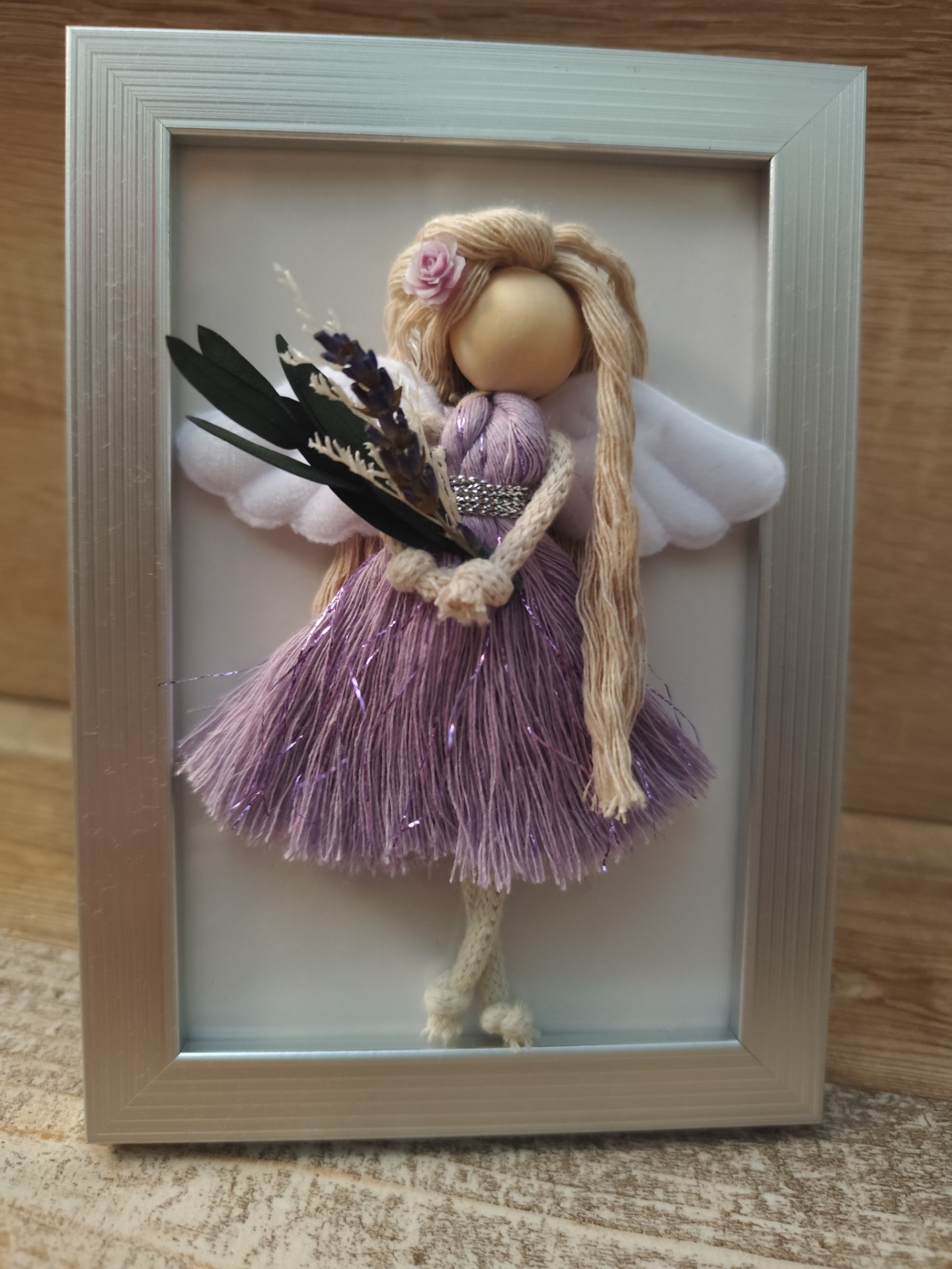 Andělka ve stříbrném rámečku ve velikosti 12 x 17 cm. Má fialové šaty s lesklou nitkou, ve vlasech jemnou ozdobu a drží kytičku.