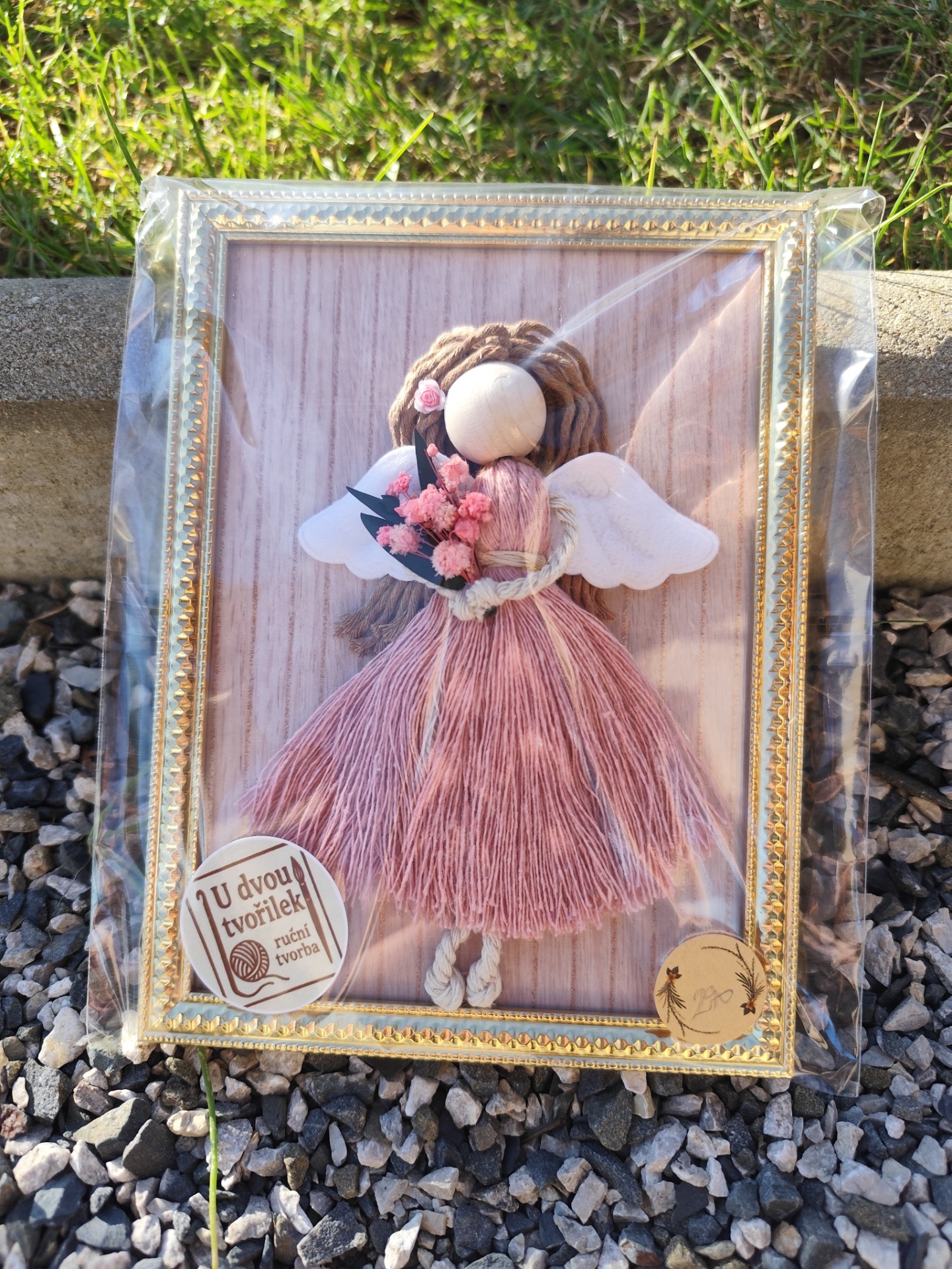 Tento roztomilý andílek vyrobený technikou macramé v růžových odstínech je umístěn ve zlatém rámečku o rozměru 15x20 cm. Každý kus je ručně vyráběný s láskou, takže je jedinečný.