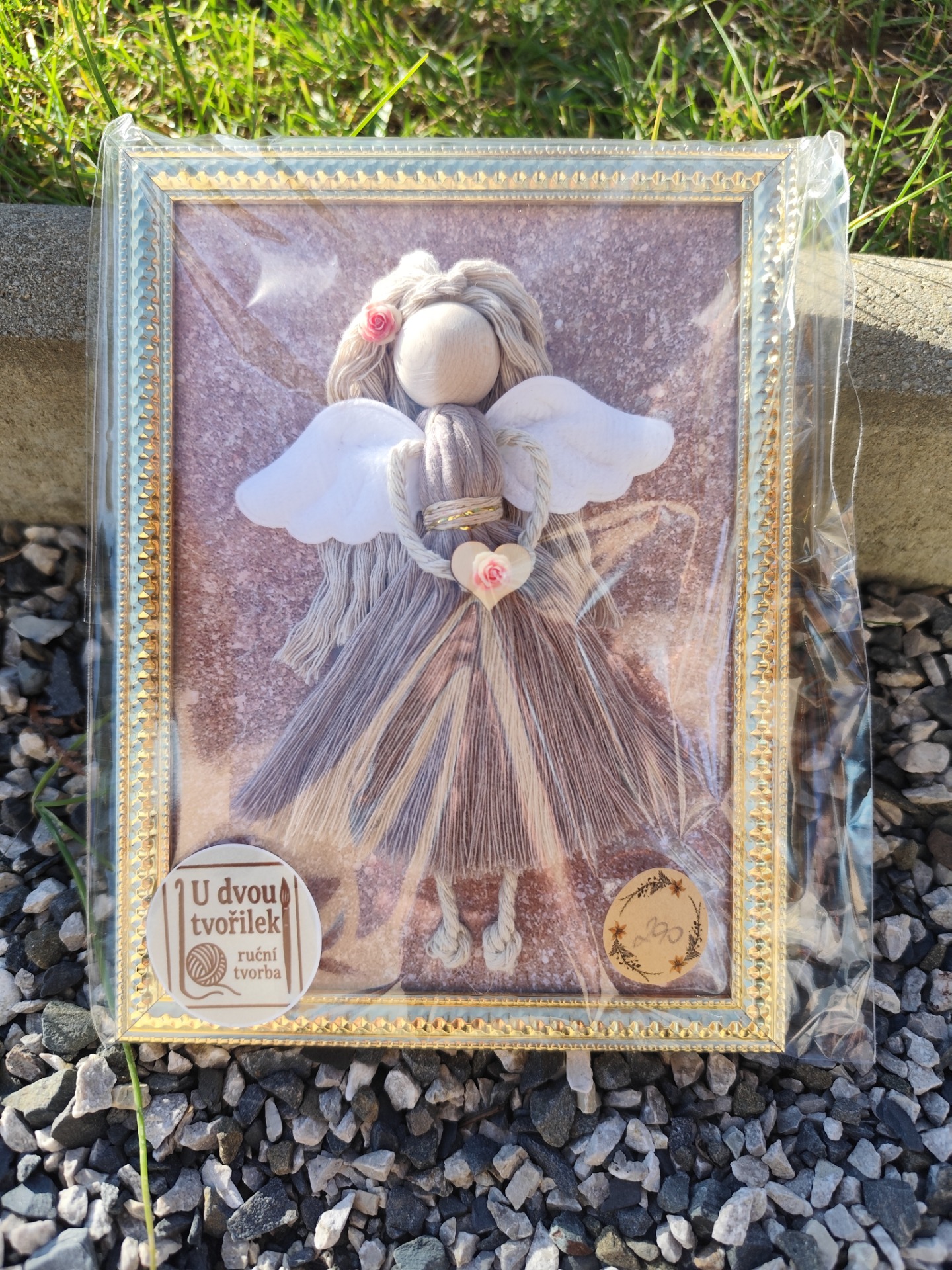 Tento roztomilý andílek vyrobený technikou macramé v běžových a růžových odstínech je umístěn ve zlatém rámečku o rozměru 15x20 cm. Každý kus je ručně vyráběný s láskou, takže je jedinečný.