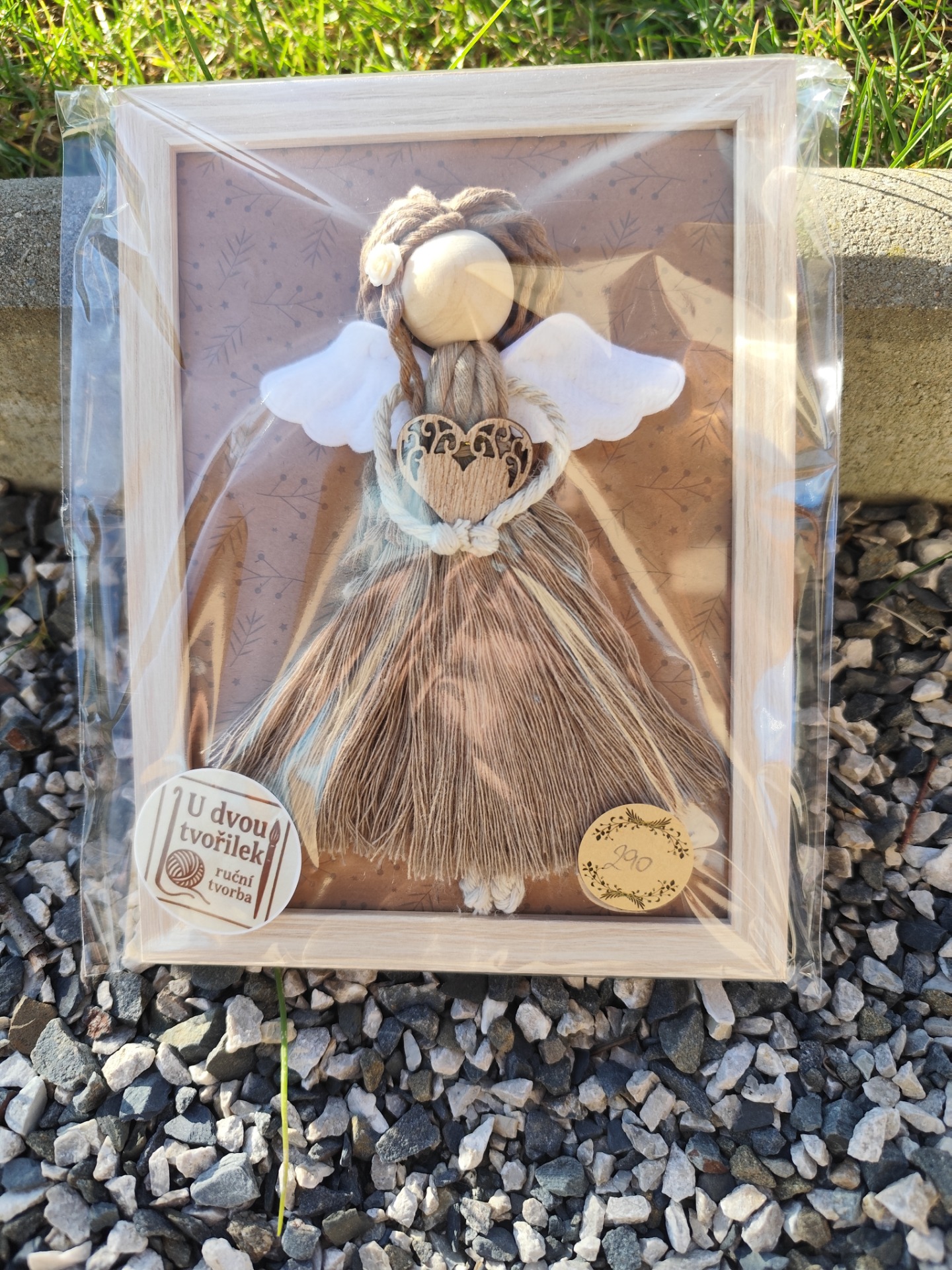 Tento roztomilý andílek vyrobený technikou macramé v přírodních odstínech je umístěn ve dřevěném rámečku o rozměru 15x20 cm. Každý kus je ručně vyráběný s láskou, takže je jedinečný.