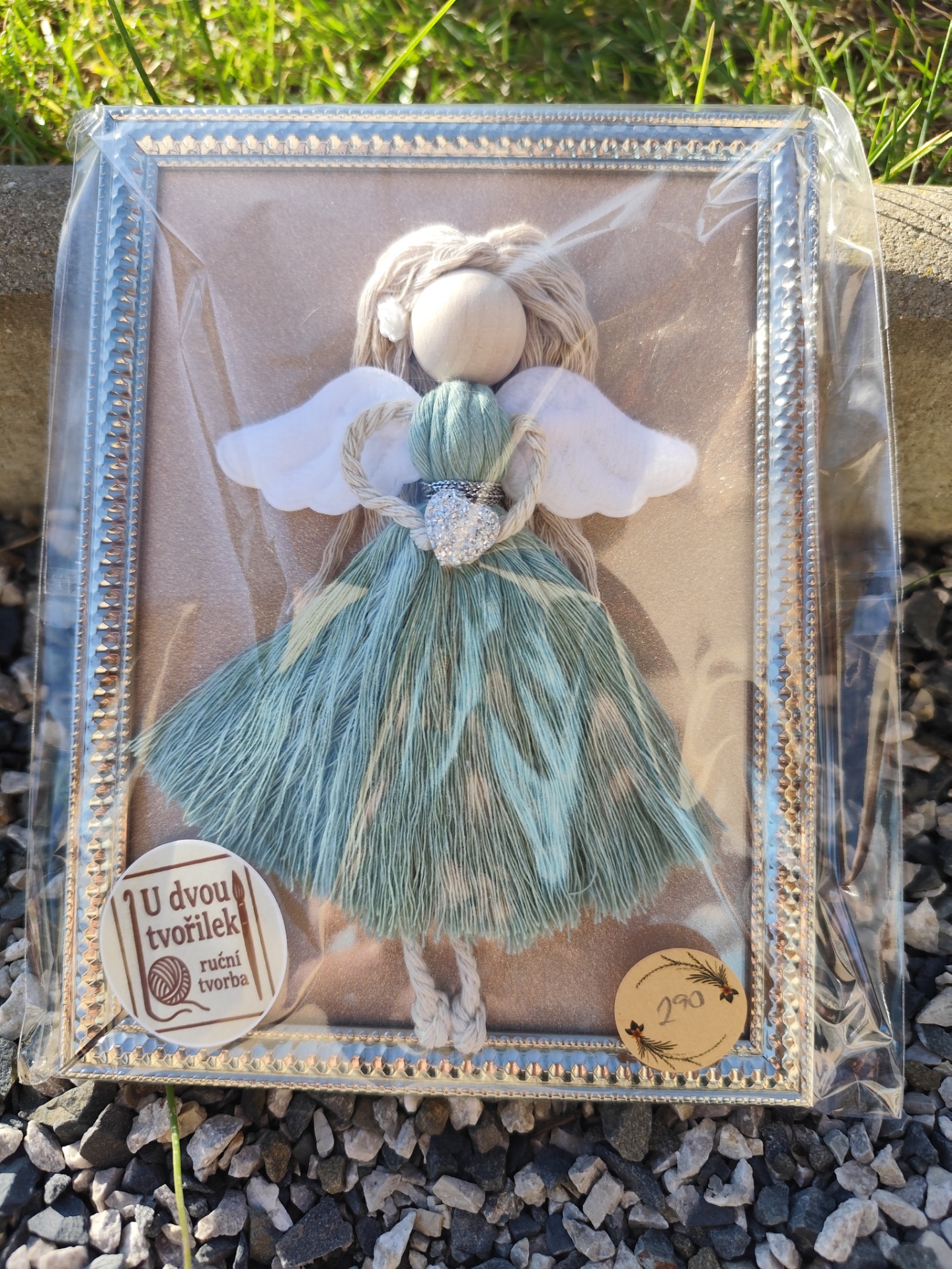 Tento roztomilý andílek vyrobený technikou macramé v modrých šatech je umístěn ve stříbrném rámečku o rozměru 15x20 cm. Každý kus je ručně vyráběný s láskou, takže je jedinečný.