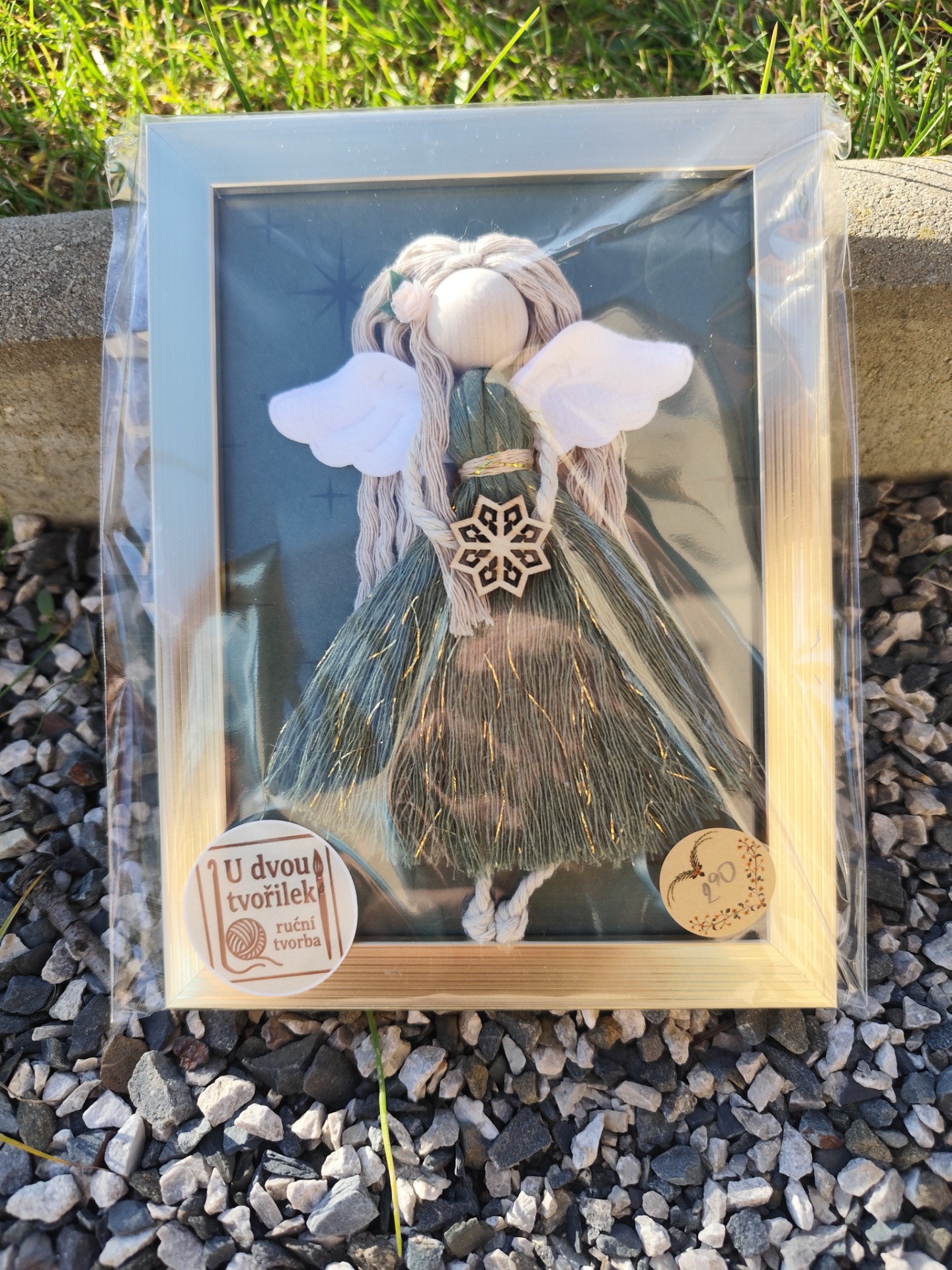 Tento roztomilý andílek vyrobený technikou macramé v zelených odstínech je umístěn ve zlatém rámečku o rozměru 15x20 cm. Každý kus je ručně vyráběný s láskou, takže je jedinečný.