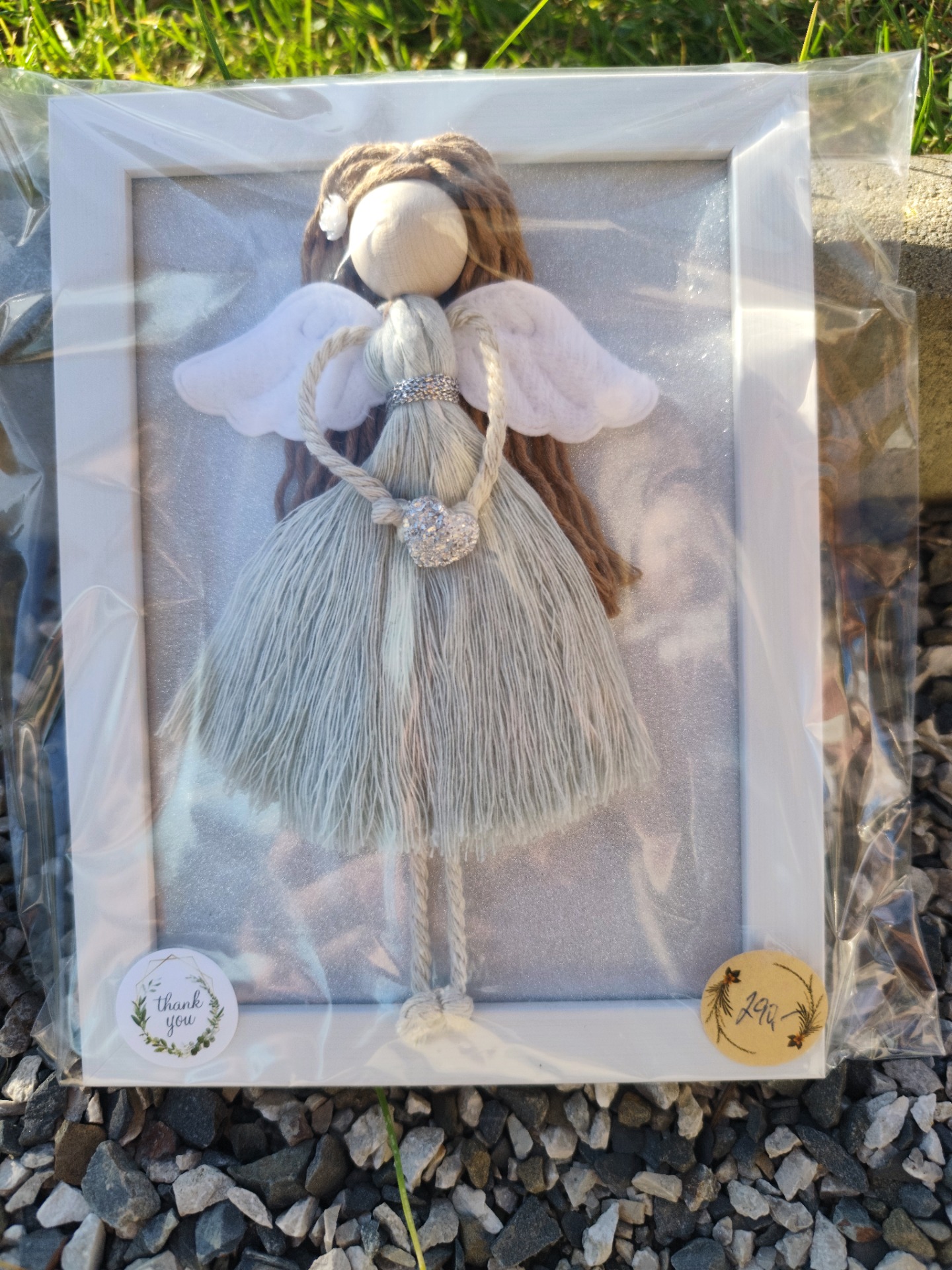Tento roztomilý andílek vyrobený technikou macramé ve stříbrných odstínech s ledově modrými šaty je umístěn v bílém rámečku o rozměru 15x20 cm. Každý kus je ručně vyráběný s láskou, takže je jedinečný.