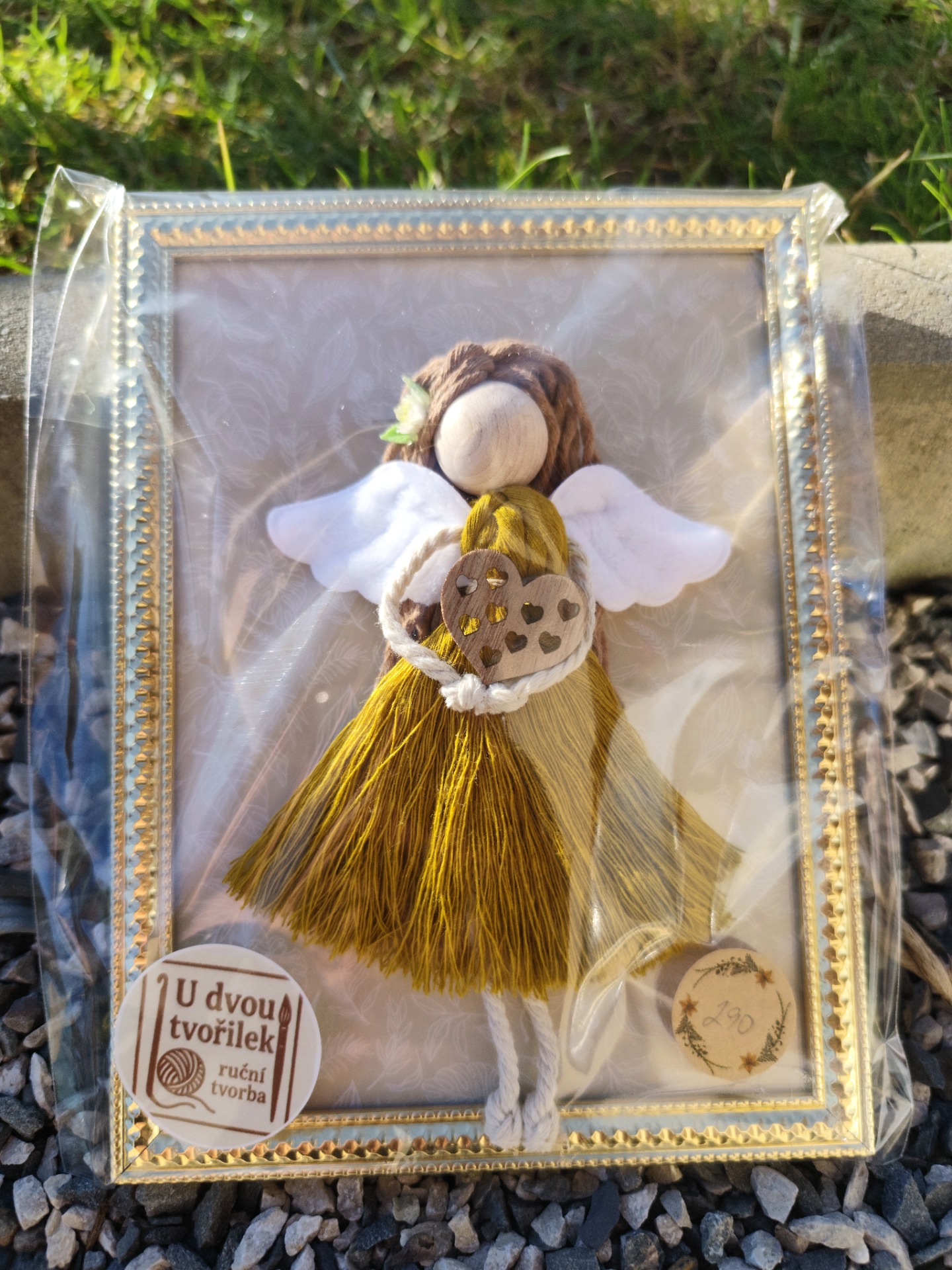 Tento roztomilý andílek vyrobený technikou macramé v hořčicových šatech je umístěn ve zlatém rámečku o rozměru 15x20 cm. Každý kus je ručně vyráběný s láskou, takže je jedinečný.