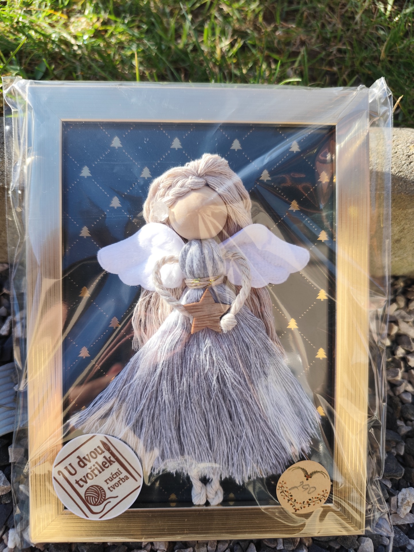 Tento roztomilý andílek vyrobený technikou macramé v šedozelených odstínech je umístěn ve zlatém rámečku o rozměru 15x20 cm. Každý kus je ručně vyráběný s láskou, takže je jedinečný.