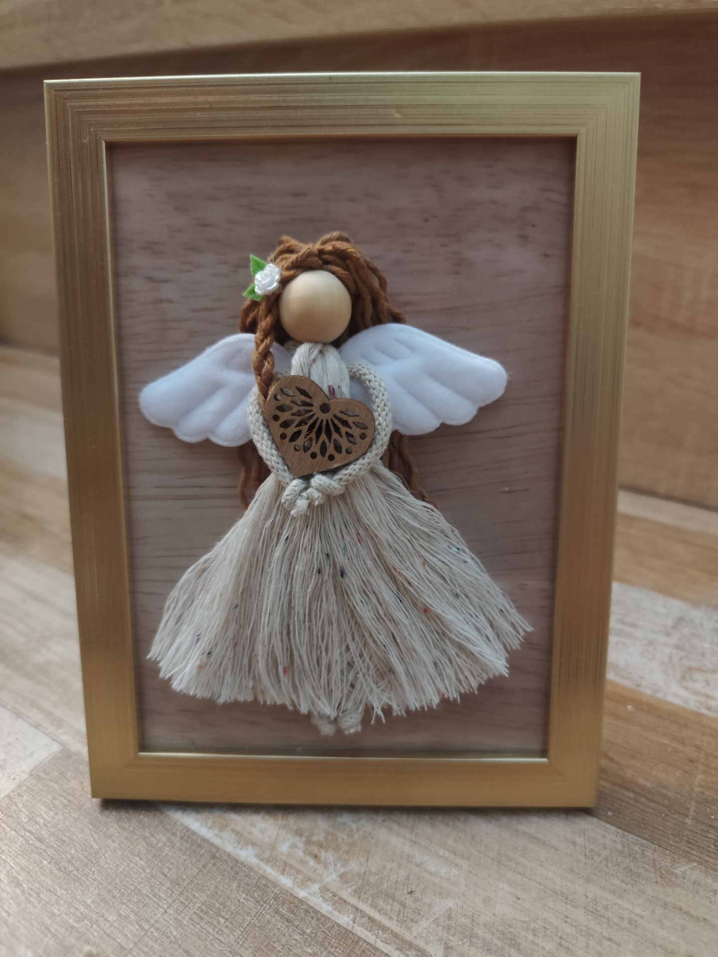 Andělka ve zlatém rámečku ve velikosti 15 x 20 cm. Má světlé šaty s barevnými nopky a ve vlasech jemnou ozdobu, v ruce drží ❤️