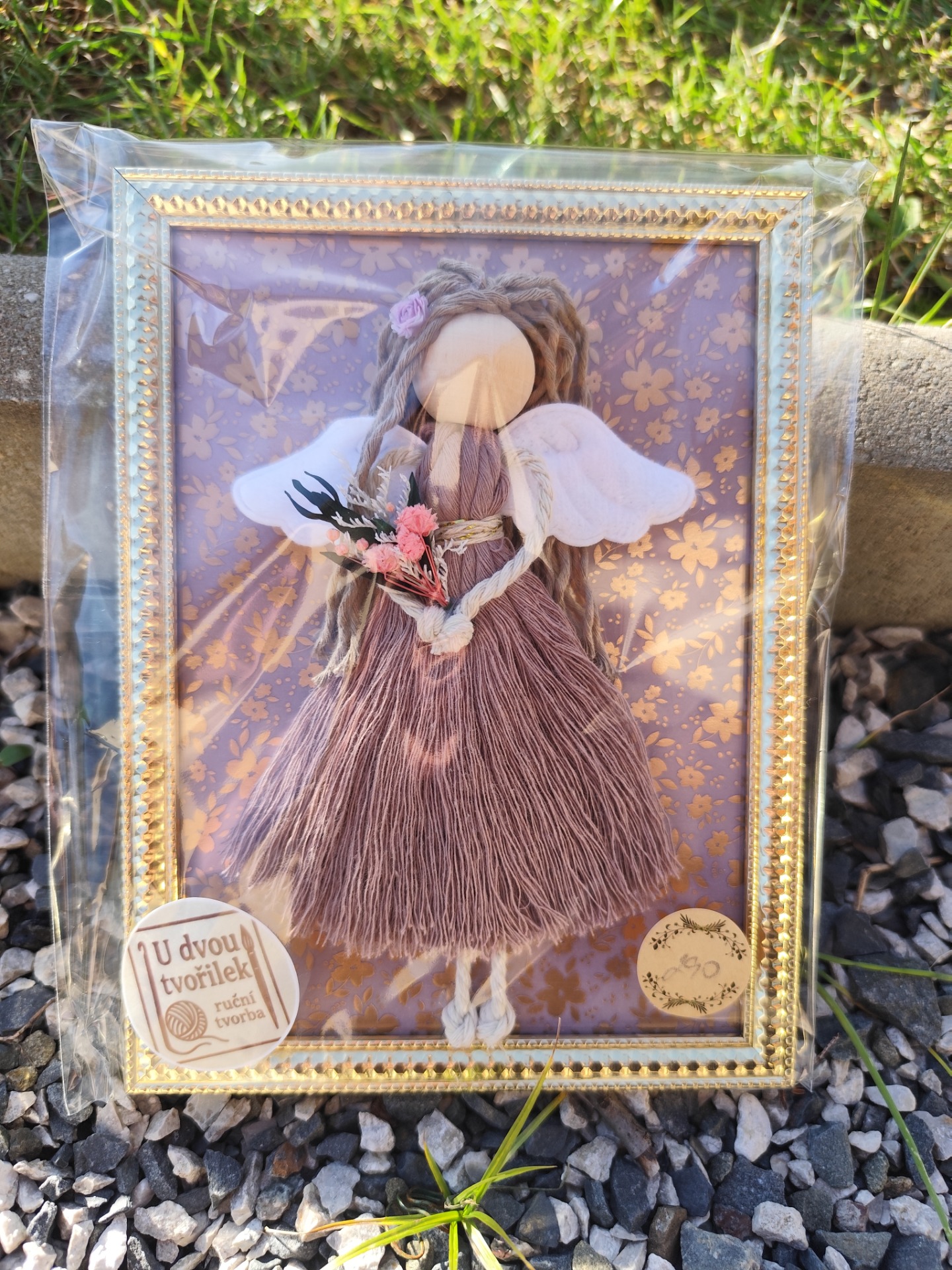 Tento roztomilý andílek vyrobený technikou macramé v fialkovohnědých odstínech je umístěn ve zlatém rámečku o rozměru 15x20 cm. Každý kus je ručně vyráběný s láskou, takže je jedinečný.