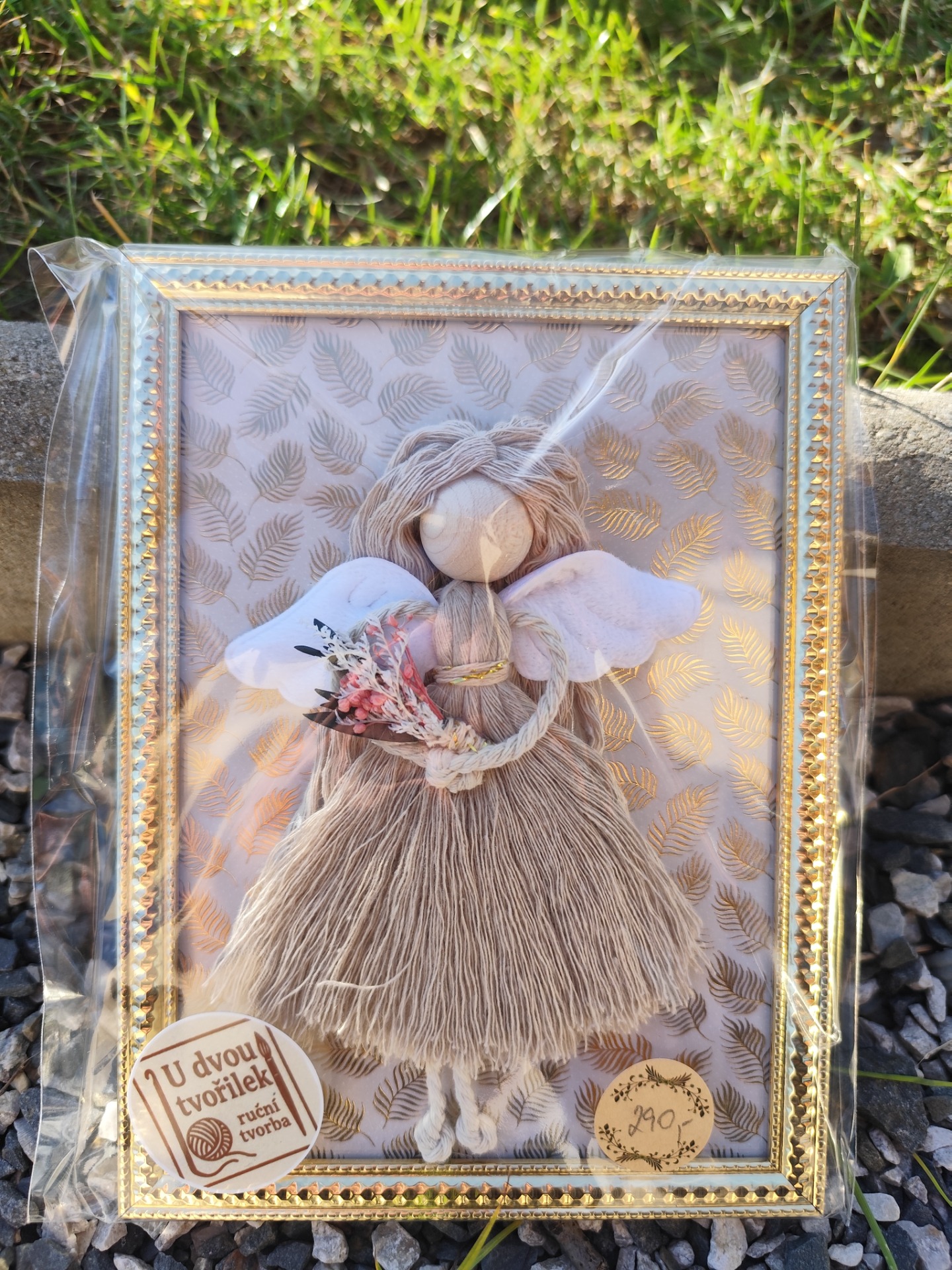 Tento roztomilý andílek vyrobený technikou macramé v krémových odstínech je umístěn ve zlatém rámečku o rozměru 15x20 cm. Každý kus je ručně vyráběný s láskou, takže je jedinečný.
