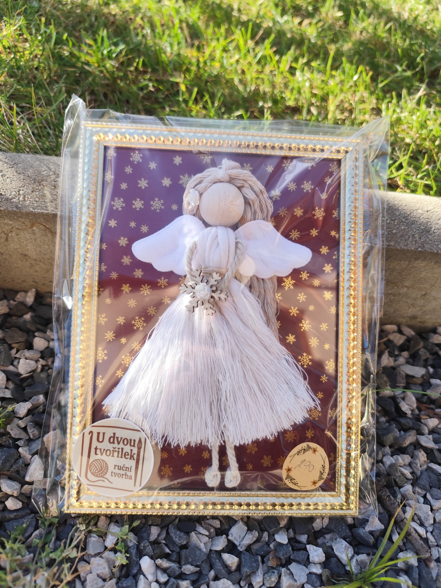 Tento roztomilý andílek vyrobený technikou macramé ve vánočním duchu s bílými šaty je umístěn ve zlatém rámečku o rozměru 15x20 cm. Každý kus je ručně vyráběný s láskou, takže je jedinečný.
