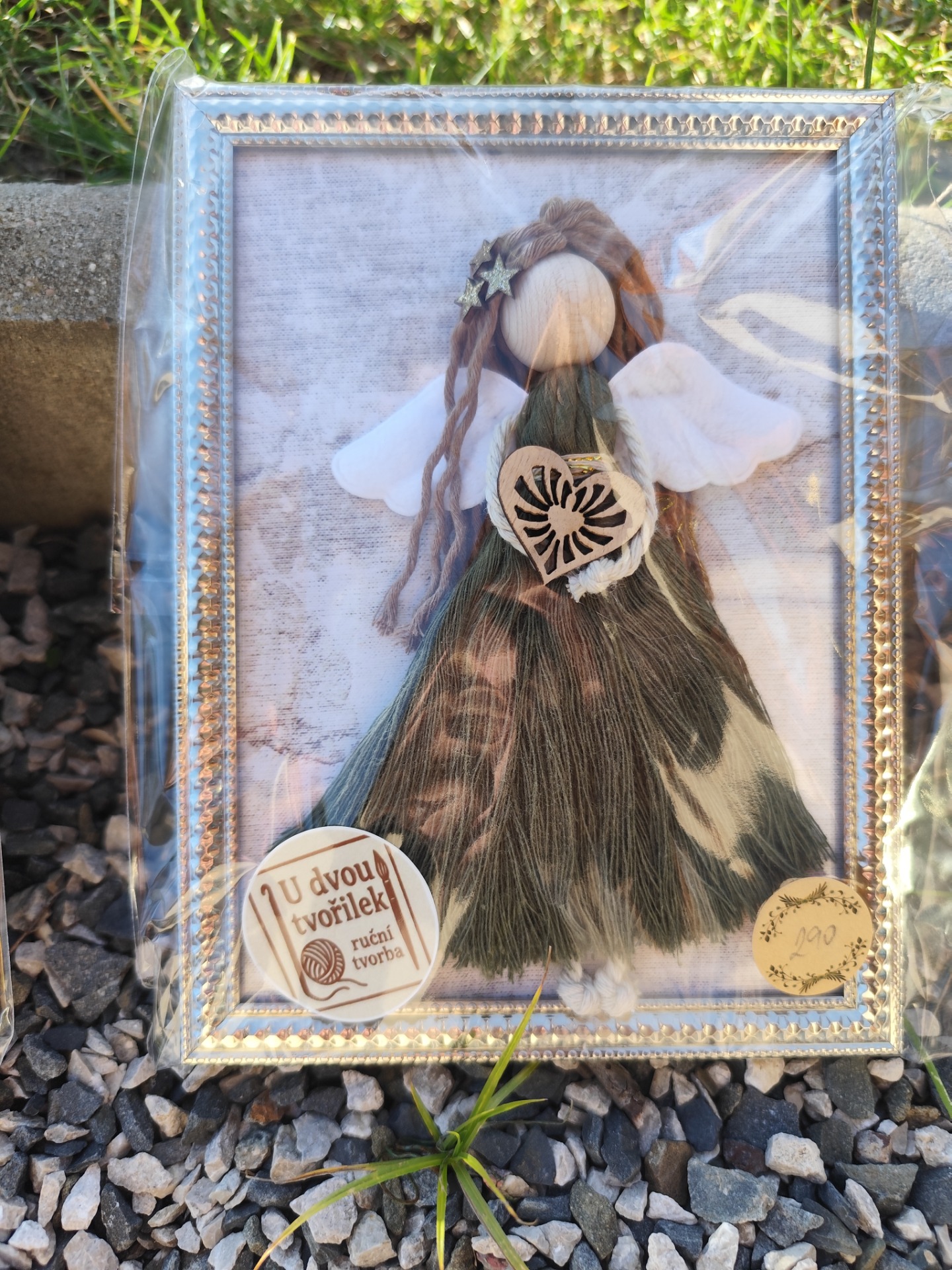 Tento roztomilý andílek vyrobený technikou macramé v zelených odstínech je umístěn ve stříbrném rámečku o rozměru 15x20 cm. Každý kus je ručně vyráběný s láskou, takže je jedinečný.