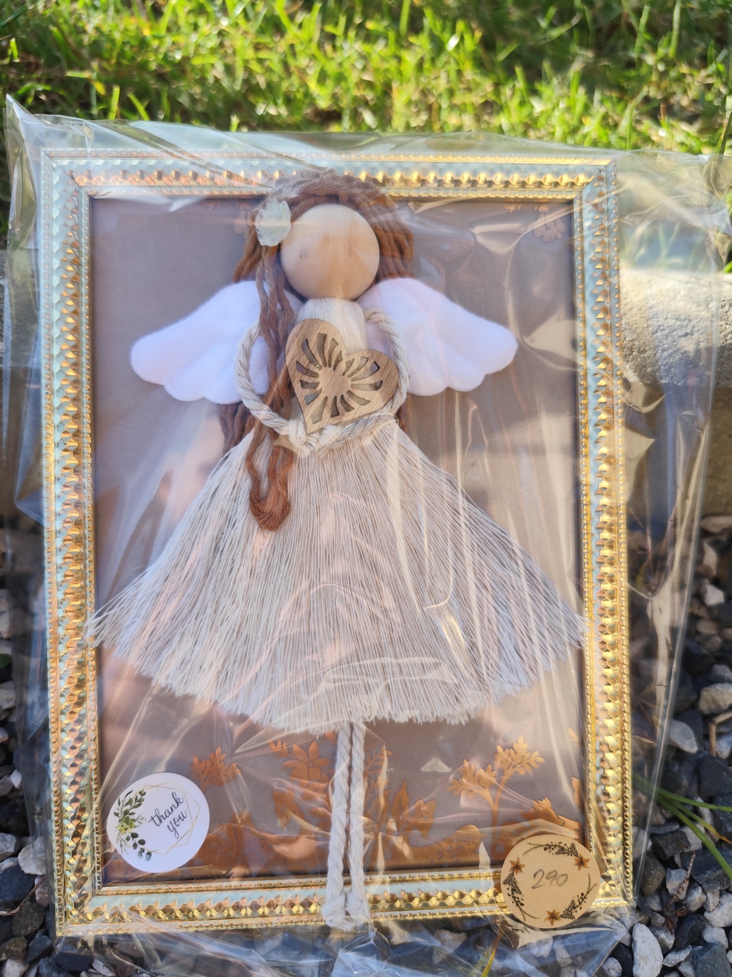 Tento roztomilý andílek vyrobený technikou macramé v bílých odstínech je umístěn ve zlatém rámečku o rozměru 15x20 cm. Každý kus je ručně vyráběný s láskou, takže je jedinečný.