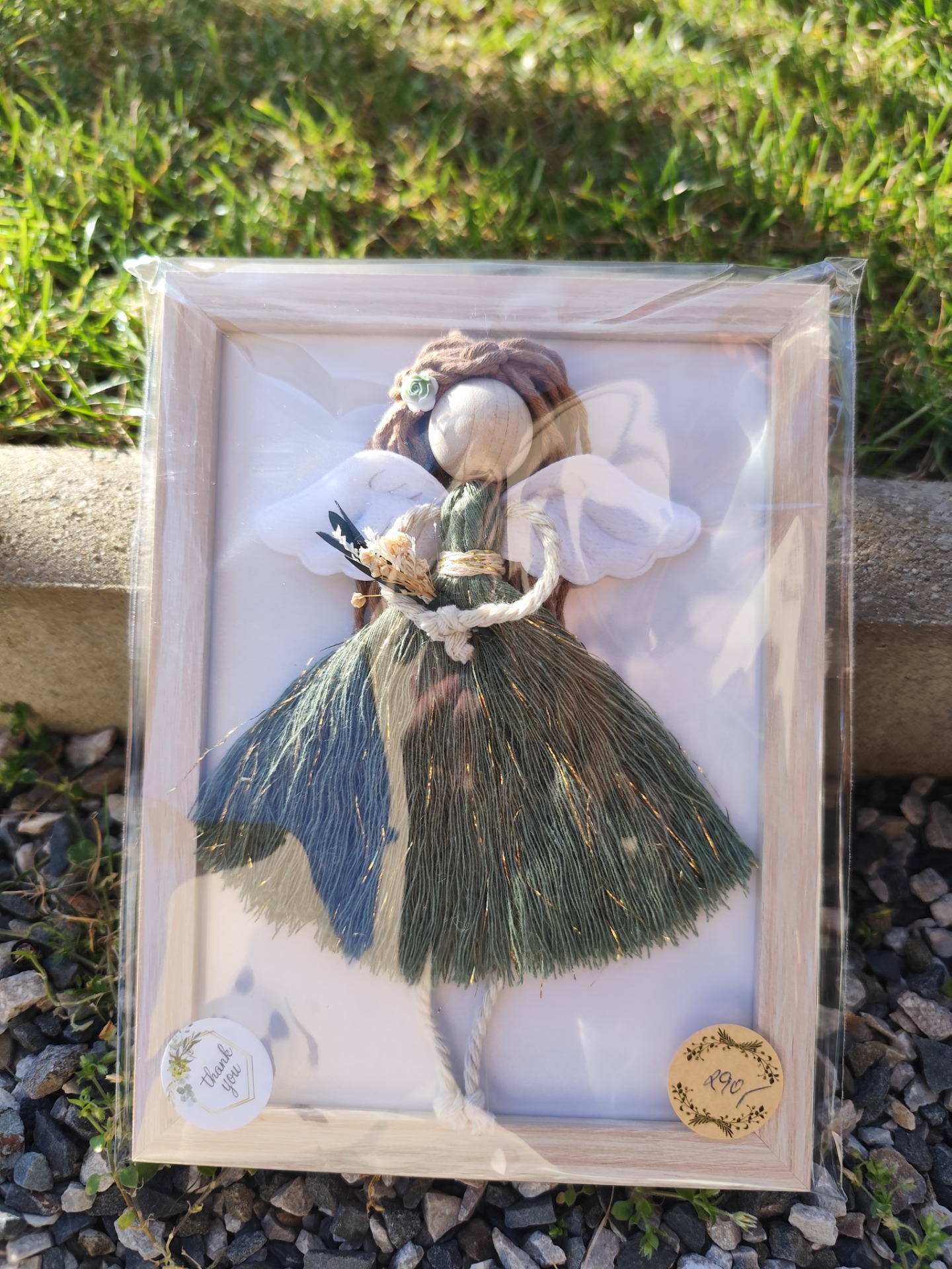 Tento roztomilý andílek vyrobený technikou macramé v zelených odstínech je umístěn v dřevěném rámečku o rozměru 15x20 cm. Každý kus je ručně vyráběný s láskou, takže je jedinečný.