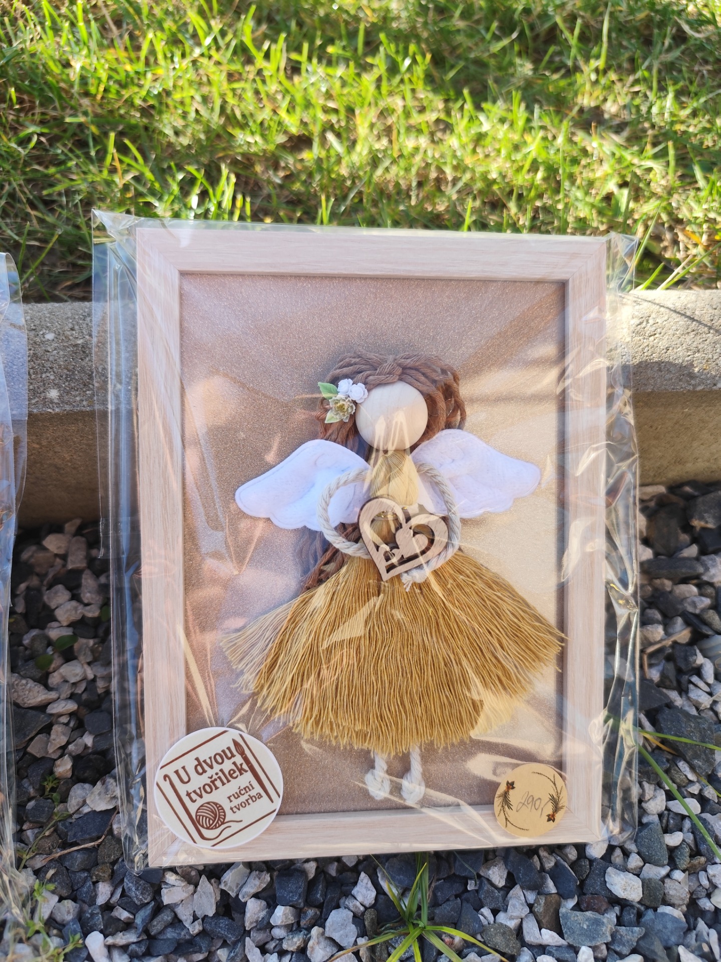 Tento roztomilý andílek vyrobený technikou macramé v žlutých odstínech je umístěn v dřevěném rámečku o rozměru 15x20 cm. Každý kus je ručně vyráběný s láskou, takže je jedinečný.