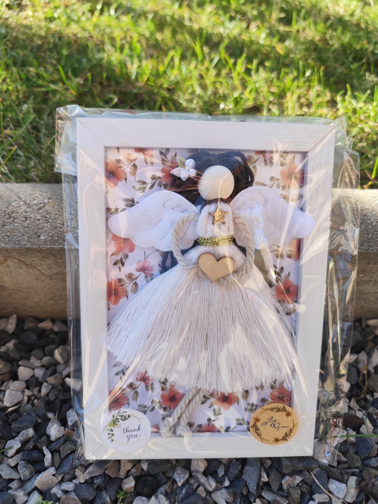 Tento roztomilý andílek vyrobený technikou macramé v bílých odstínech s květinovým pozadím je umístěn v bílém rámečku o rozměru 12x17 cm. Každý kus je ručně vyráběný s láskou, takže je jedinečný.