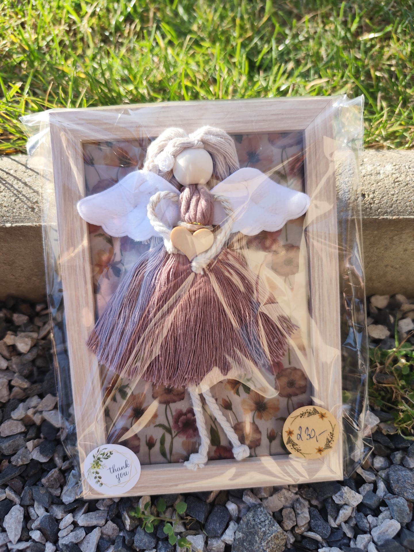 Tento roztomilý andílek vyrobený technikou macramé v béžových odstínech s květinovým pozadím je umístěn v dřevěném rámečku o rozměru 12x17 cm. Každý kus je ručně vyráběný s láskou, takže je jedinečný.