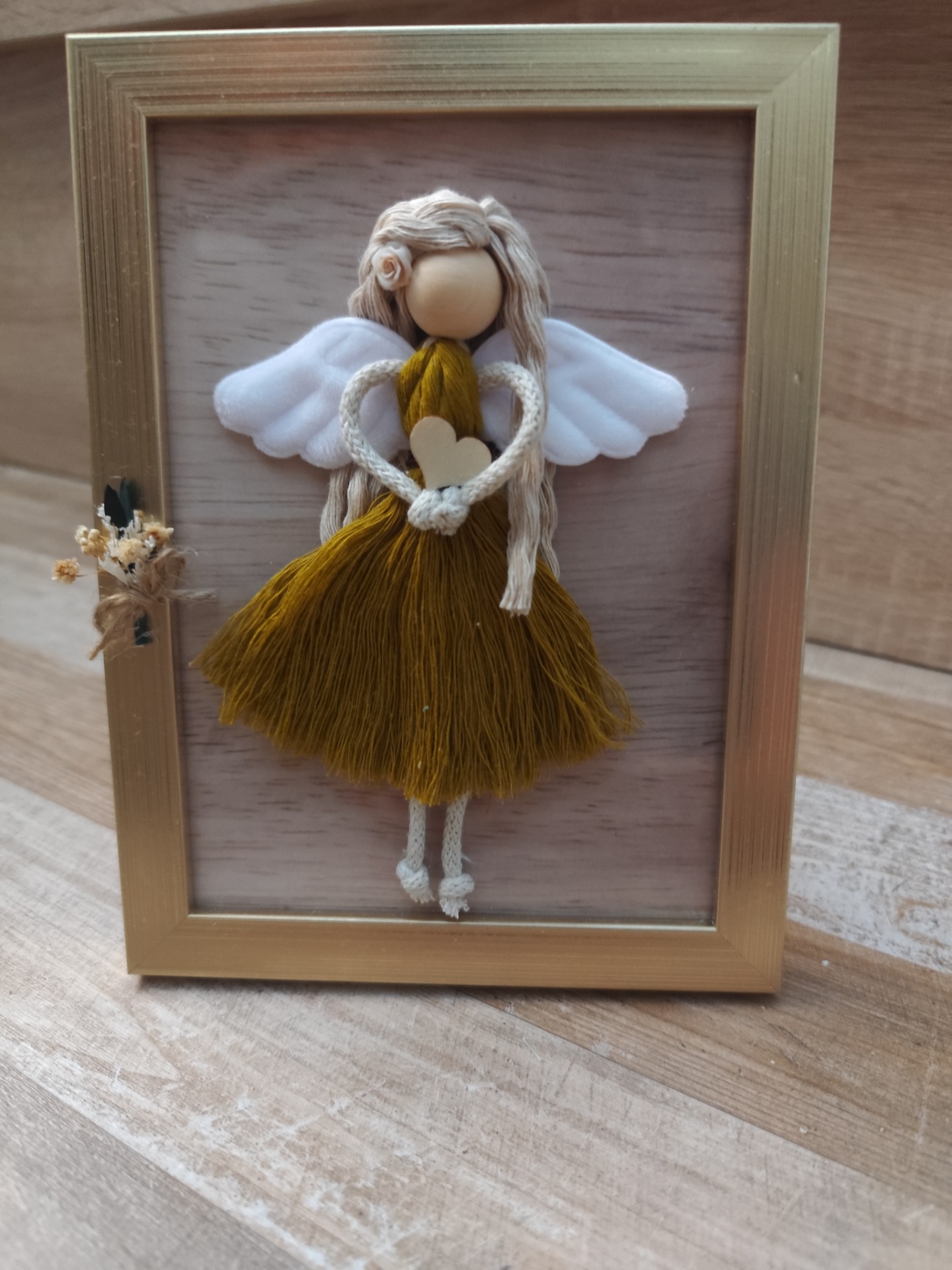 Andělka ve zlatém rámečku ve velikosti 15 x 20 cm. Má šaty v barvě hořčice, jemnou ozdobu ve vlasech, v ruce drží ❤️ a rám je zdobený malou kytičkou.