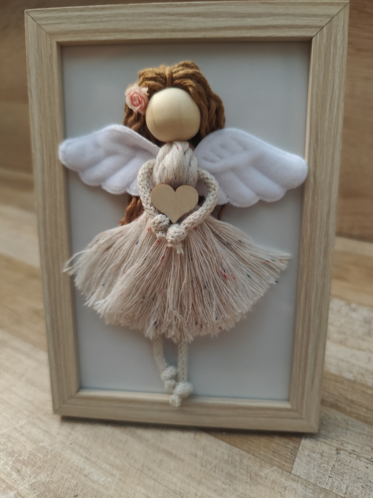 Andělka v přírodním rámečku ve velikosti 12 x 17 cm. Má krémové šaty s barevnými nopky, jemnou ozdobu ve vlasech a drží ❤️