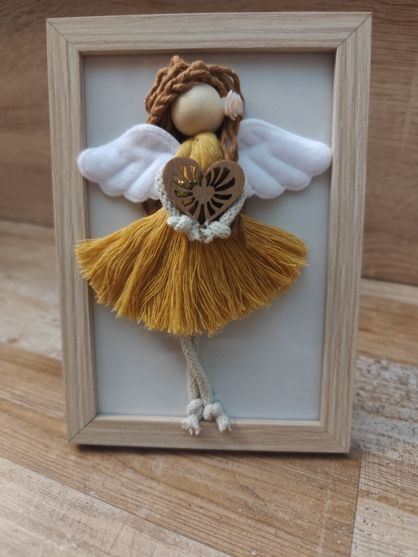 Andělka v přírodním rámečku ve velikosti 12 x 17 cm. Má žluté šaty, ve vlasech jemnou ozdobu a drží ❤️