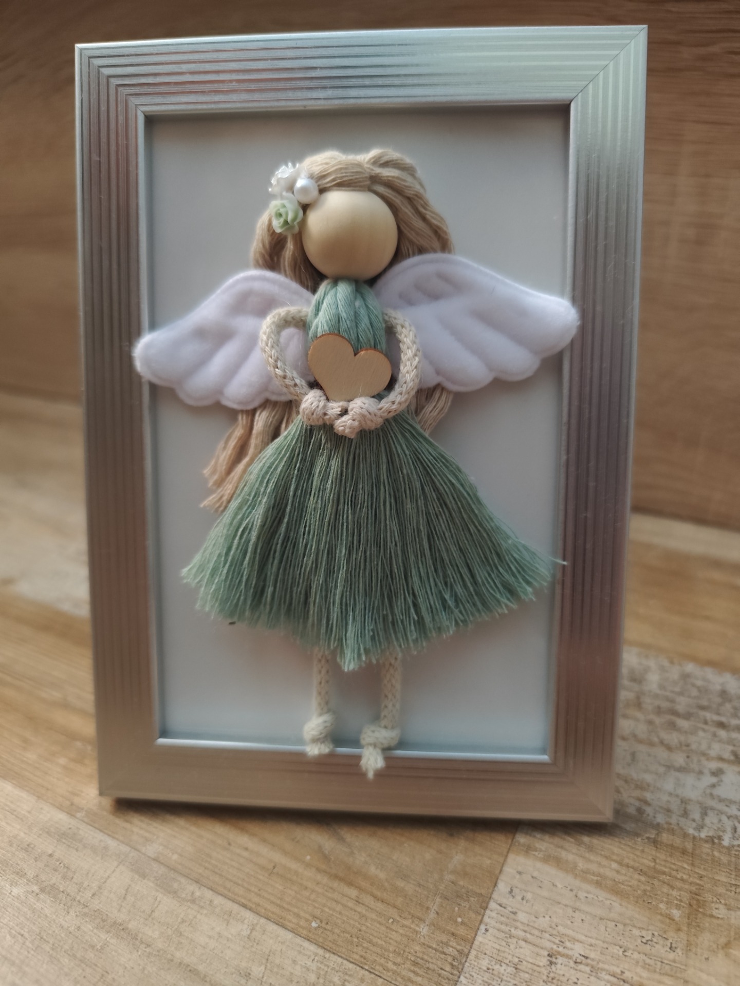 Andělka ve stříbrném rámečku ve velikosti 12 x 17 cm. Má šaty v barvě máty, ve vlasech jemnou ozdobu a drží ❤️