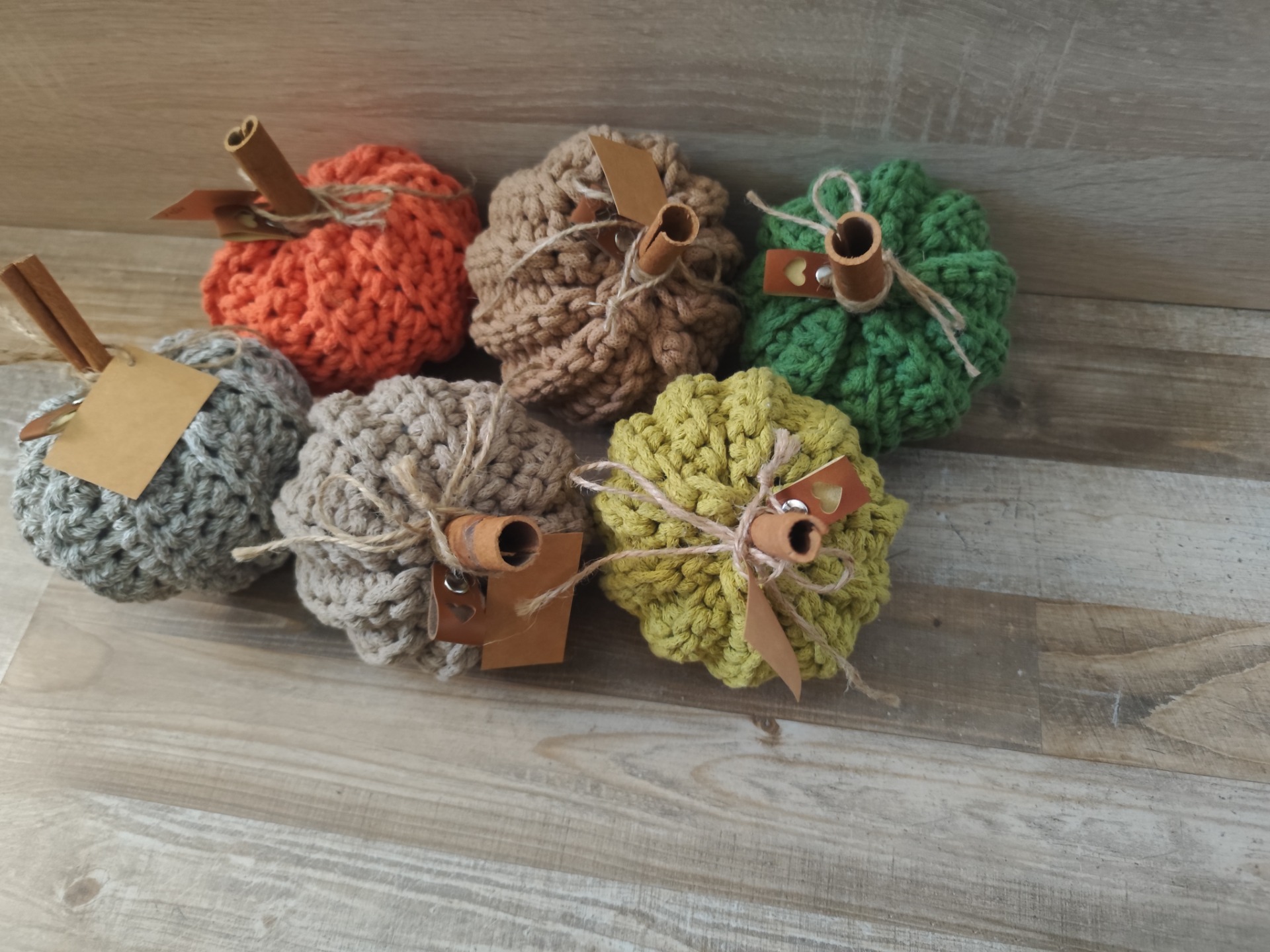 Háčkované dýně různých barev, na fotce aktuálně dostupné.