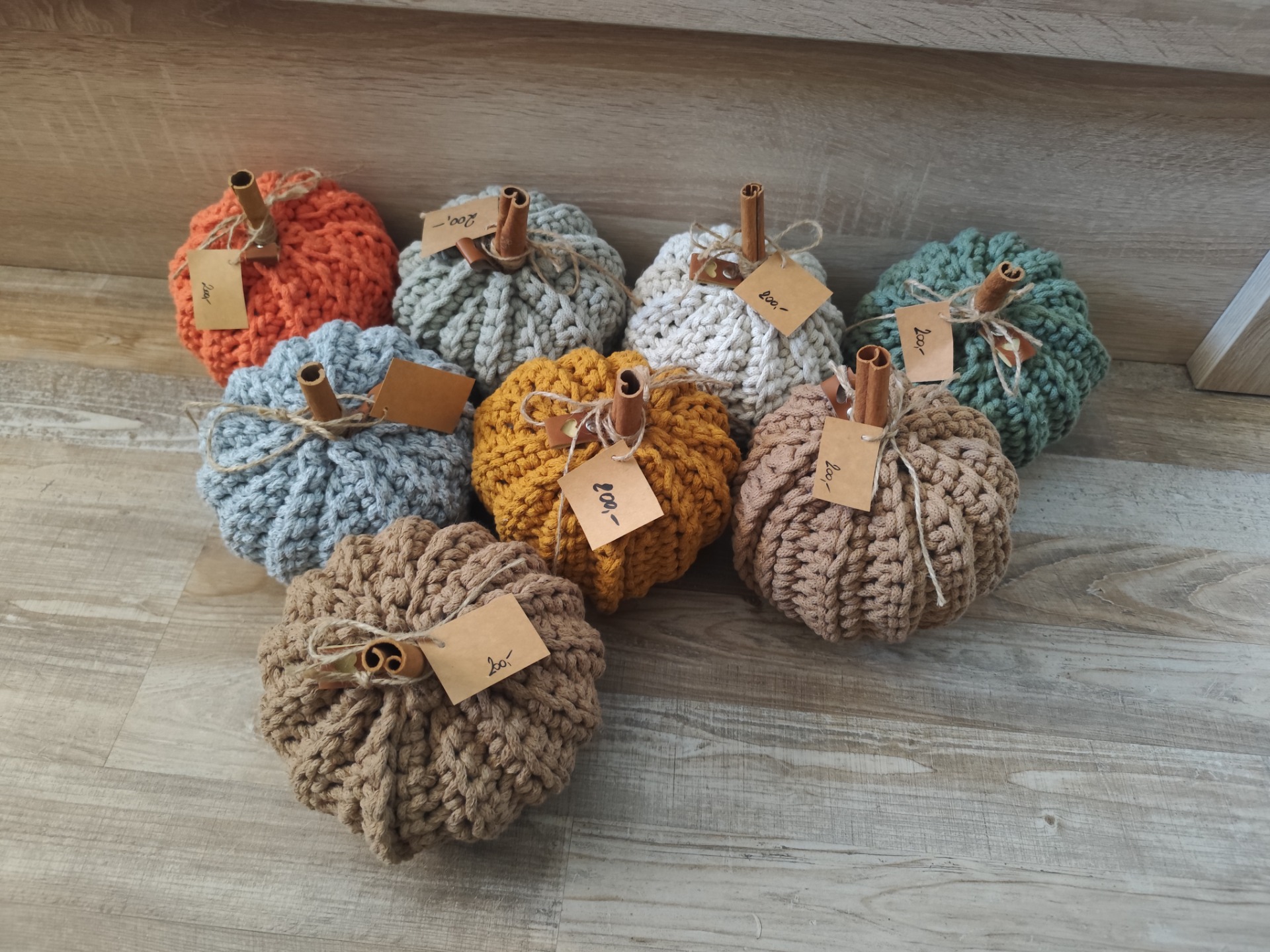 Háčkované dýně různých barev, na fotce aktuálně dostupné.